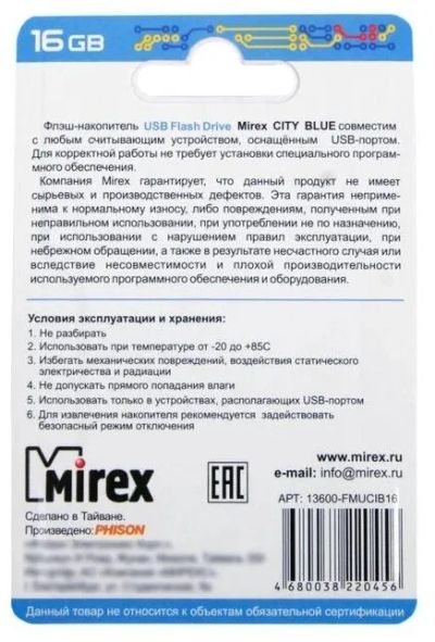 Флешка MIREX 16GB USB 2.0 CITY BLUE (ecopack)