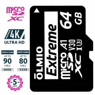 Карта памяти OLMIO microSDXC 64GB Extreme, UHS-I (U3) V30 A1, R:90MB/s, W:80MB/s, c адаптером